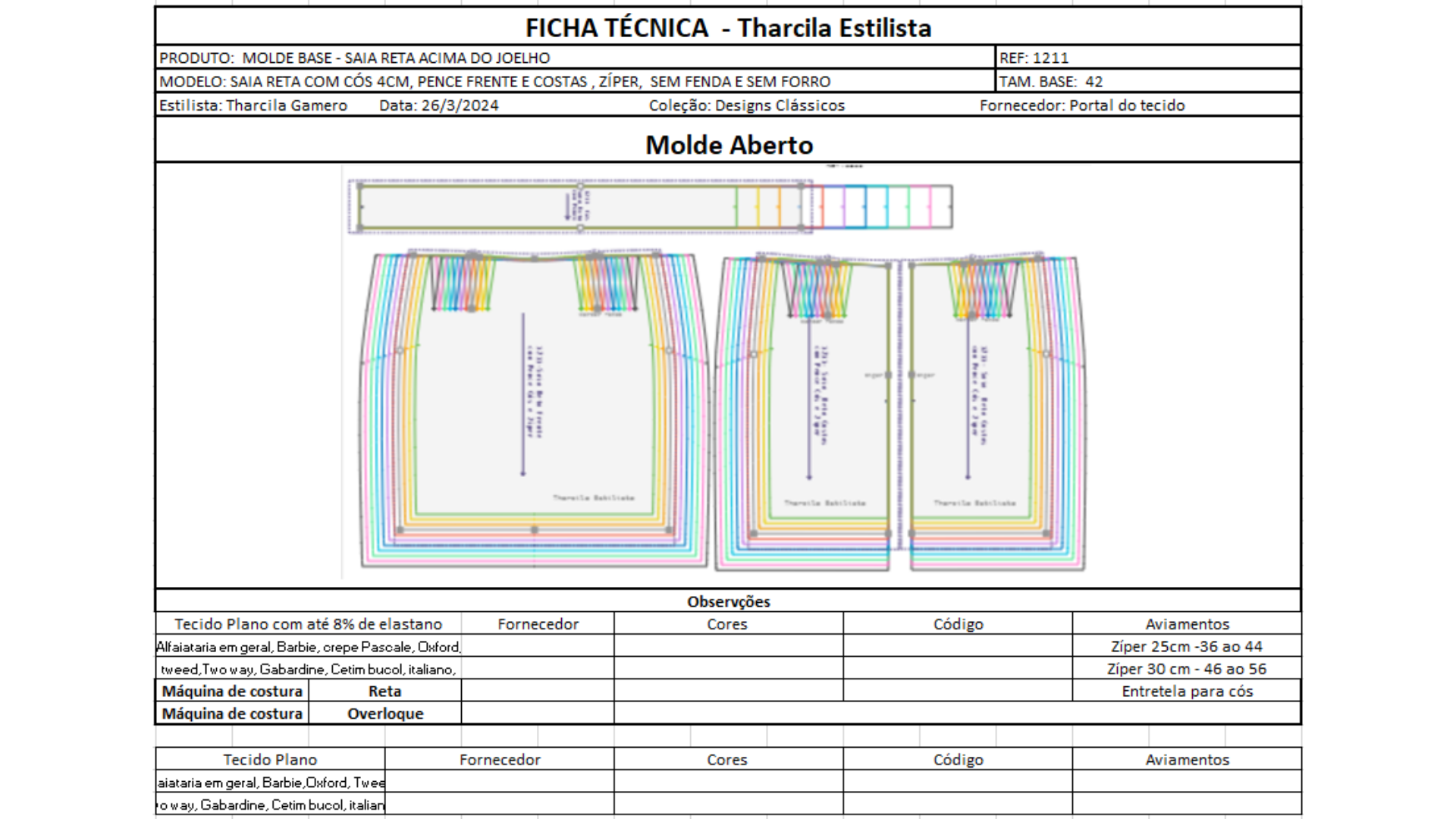 As peças são inicialmente desenvolvidas no corpo e testadas no tecido, permitindo avaliar proporções, ajustes e detalhes de modelagem. Após a prova e aprovação do cliente, o molde é preparado para a construção das grades de tamanhos, garantindo consistência entre as numerações.